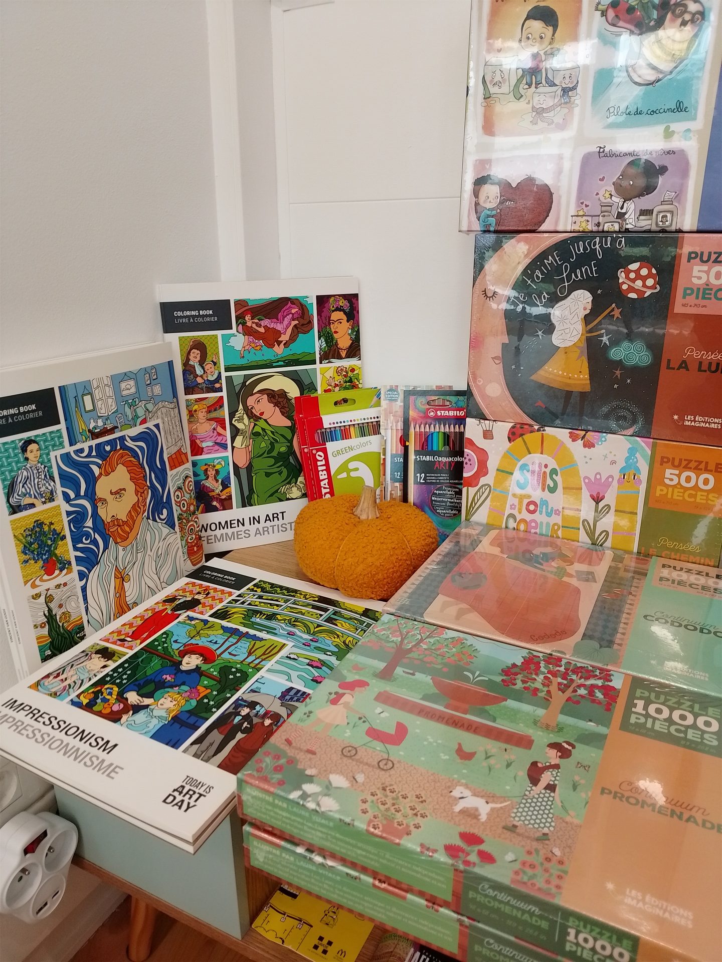Et pour poursuivre l’exploration artistique initiée à travers notre programmation d’expositions d’illustrations jeunesse et d’ateliers artistiques, petits et grands peuvent découvrir une belle sélection de produits coups de cœur : albums jeunesse, jeux, matériels artistiques, kits créatifs, et autres objets hautement esthétiques et ludiques ! 🙂